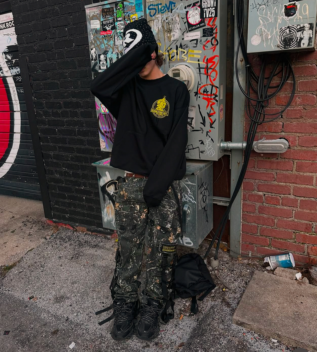 Oversized black crewneck featuring light distressing throughout with yellow DTG print icons placed on the front and back. Designed with a relaxed silhouette that emphasizes texture and balanced graphic placement.
